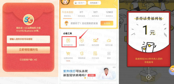 打开地址->领取成功后->立即使用->再打开电信APP->去我->必备工具->我的福利包->拆开话费福利包即可